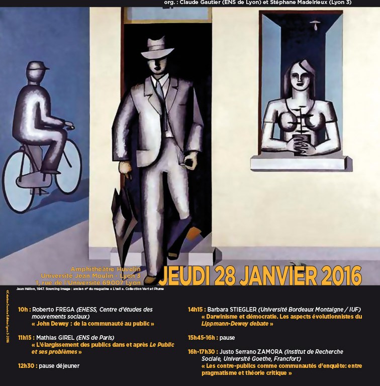 J’étais hier à Lyon III pour notre séminaire commun Catégories du pragmatisme (ENS EHESS ENS-LSH Lyon III) qui portait cette fois sur la notion de « Publics », développée notamment par Dewey dans Le public et ses problèmes. Le principe de ce séminaire, qui en est maintenant à sa deuxième année, est de proposer le matin des synthèses sur les notions fréquemment mobilisées dans le courant pragmatiste, et de permettre l’après-midi à des collègues chercheurs de donner des développements de recherches en cours.