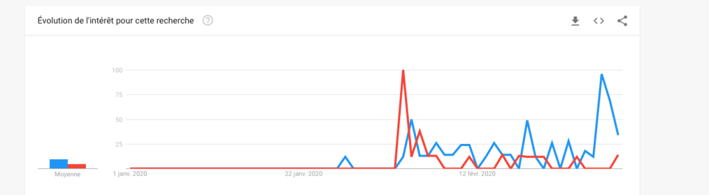 En attendant, s’il est toujours difficile de rapporter la diffusion d’un terme à une opération de communication, il est certain que celui d’infodémie connaît une circulation démultipliée après le discours de février du DG de l’OMS, comme le montre une recherche rapide sur Google Trends, en anglais comme en français: