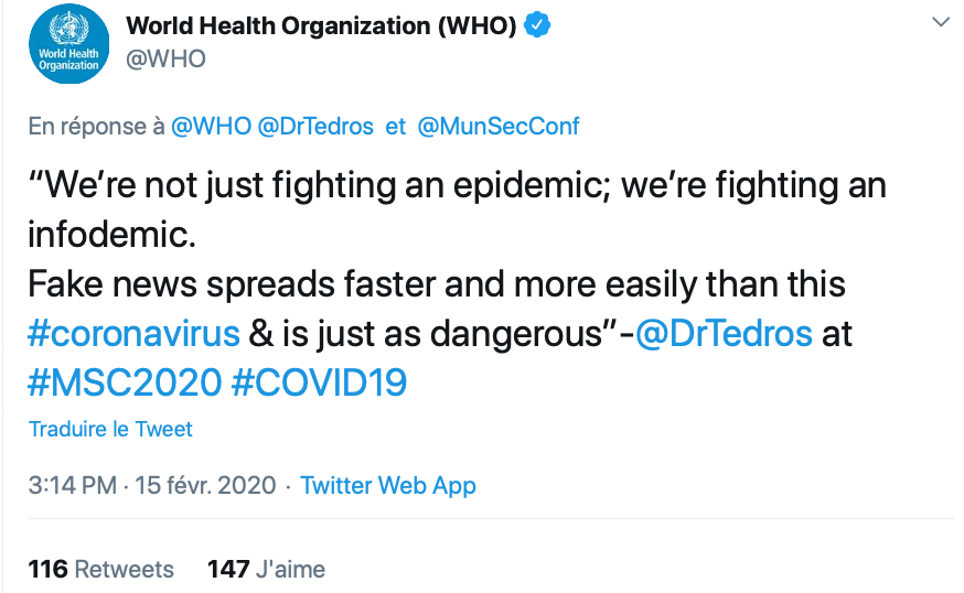 Commençons par le plus évident : c’est la communication de l’OMS qui installe l’infodémie au coeur des débats publics, par la voix de son Directeur Général, Tedros Adhanom Ghebreyesus: