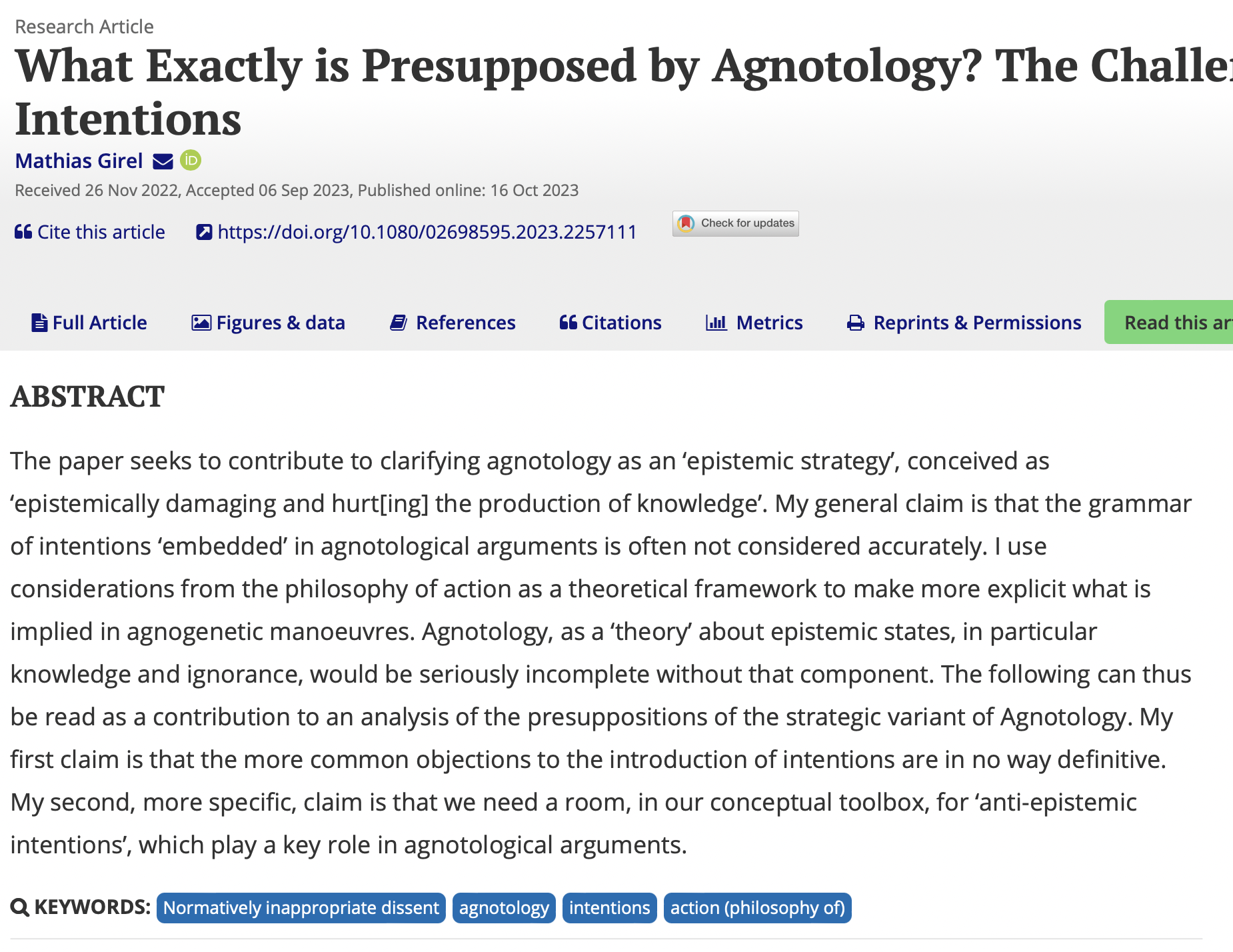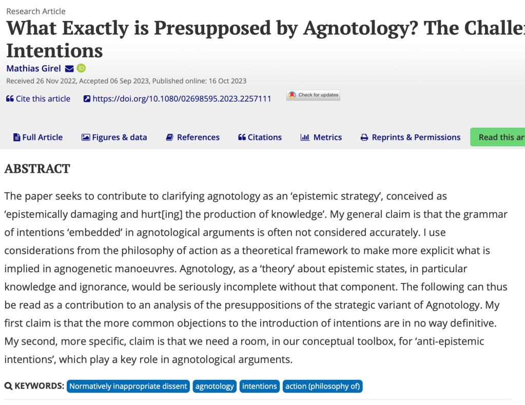 Mathias Girel (2023) What Exactly is Presupposed by Agnotology? The Challenge of Intentions, International Studies in the Philosophy of Science, DOI: 10.1080/02698595.2023.2257111