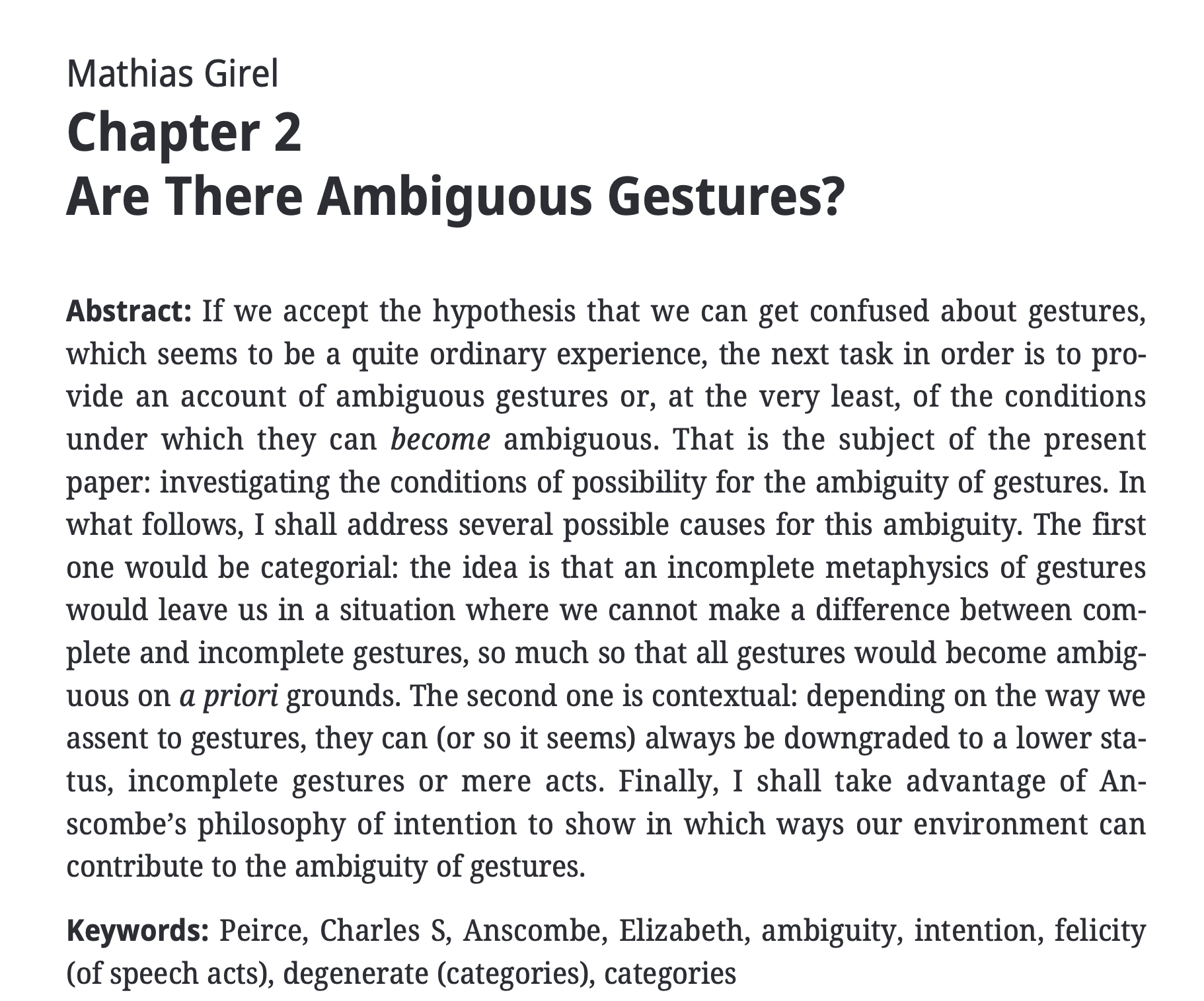 J’ai dans ce recueil collectif un texte, qui étudie la notion de « geste ambigu », qui déroute nos interprétations, et je me fonde sur Peirce, Anscombe et Austin pour entamer cette exploration. Cette enquête participe d’une réflexion plus large sur la notion de confusion, dont je partagerai bientôt les premiers résultats sur ce blog. Vous pouvez consulter ce chapitre ici.