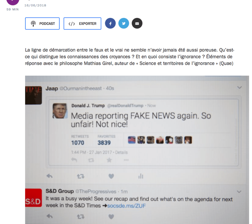 En janvier-février 2018, j’ai conseillé scientifiquement le producteur du documentaire de quatre heures diffusé sur France Culture en mai, Franck Cuveillier, en préparant avec lui les entretiens, le dossier scientifique, les thèmes et les ressources clés. Le choix des séquences, la construction du documentaire, revient au duo Franck Cuveillier / Rafik Zénine à la réalisation. Le documentaire explore, au delà de l’ignorance produite, de nombreuses … Continuer de lire Réécouter Voyage en Agnotologie