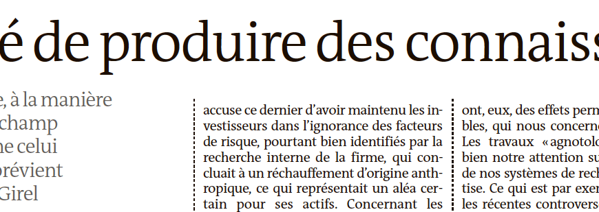 Le Monde m’avait demandé une tribune sur l’agnotologie, en marge des journées de Blois et d’autres tables rondes portant sur ce thème. J’ai proposé une réflexion sur le terme, et sur les « faux amis » que sont la post-vérité et le complotisme. Dans mon esprit, il s’agissait surtout de distinguer ces notions. Le chapeau précise que « ce champ d’études comporte des risques, comme celui d’alimenter les théories du complot » (édition papier du DIMANCHE 8 – LUNDI 9 OCTOBRE 2017). De fait, c’est plutôt la confusion avec le complotisme qui m’inquiète, comme je le développe plus longuement dans un petit livre à paraître chez Quae plus tard à l’automne. Je pense qu’il est possible d’envisager rationnellement des explications par des ententes intéressées, et que ce n’est ni un scandale intellectuel ni une faute de raisonnement, et encore moins ce que l’on entend ordinairement par « complotisme ». Il y a en fait deux dangers symétriques: celui qui consiste à voir des intentions là où il n’y en a pas, celui qui consiste à ne pas les voir lorsqu’elles sont là. Cette voie étroite est déjà celle qui était suivie par Proctor, et autant je pense qu’il y a lieu de s’inquiéter de certaines formes de complotisme, en particulier lorsqu’elles ne sont qu’un masque pour la haine d’un groupe ou d’un collectif, autant refuser par hypothèse qu’il y ait, parfois, des conspirations, c’est-à-dire des actions explicitement coordonnés d’un groupe d’agents en vue d’une fin répréhensible à l’insu du plus grand nombre, me semble être un déni de l’Histoire à peu près aussi préoccupant. Continuer de lire « Ignorance, complots et post vérité »