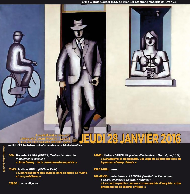 J’étais hier à Lyon III pour notre séminaire commun Catégories du pragmatisme (ENS EHESS ENS-LSH Lyon III) qui portait cette fois sur la notion de « Publics », développée notamment par Dewey dans Le public et ses problèmes. Le principe de ce séminaire, qui en est maintenant à sa deuxième année, est de proposer le matin des synthèses sur les notions fréquemment mobilisées dans le courant pragmatiste, … Continuer de lire Publics et communautés à Lyon